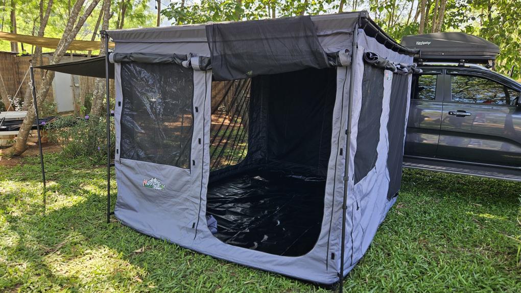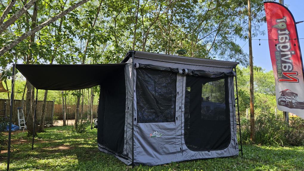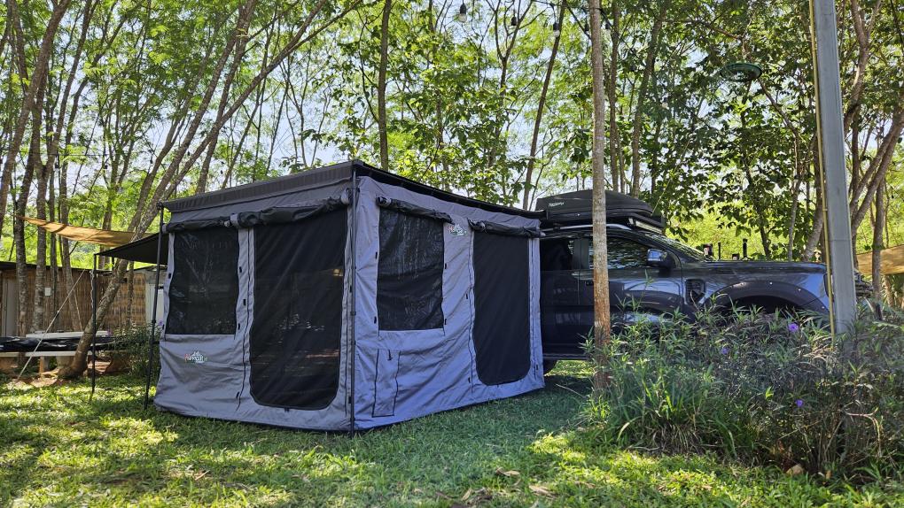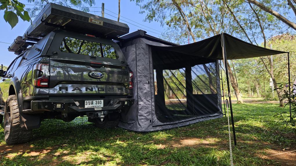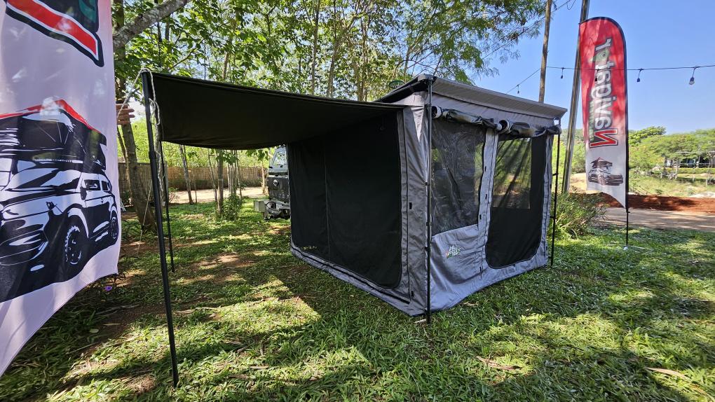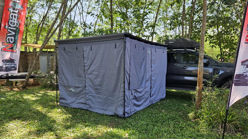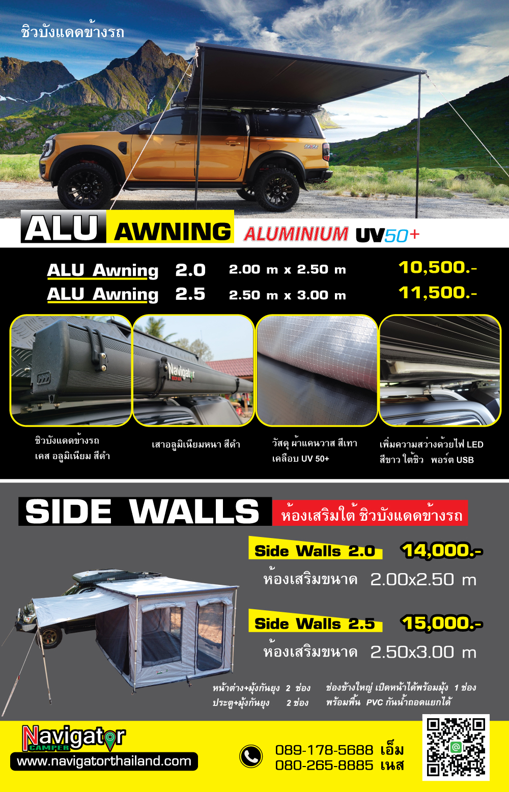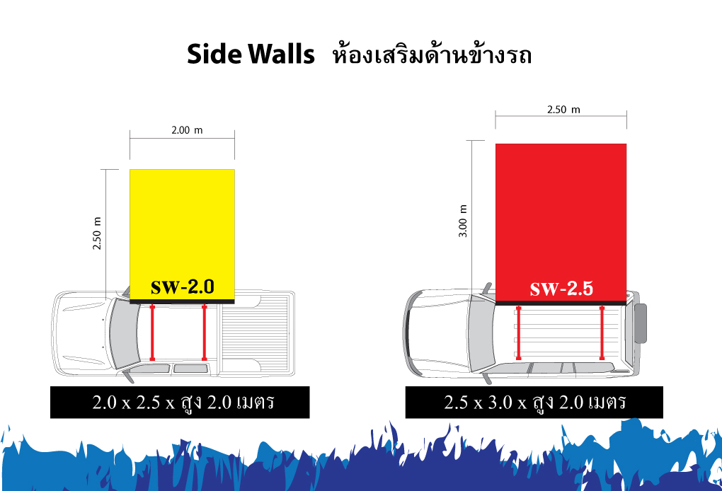 Side Walls ห้องเสริมชิวบังแดดด้านข้าง โดยต้องติดตั้งคู่กันกับ Awning เท่านั้น เป็นห้องเสริมที่สามารถนอนได้หลายคน กันน้ำ กันฝน มี 2 ขนาดให้เลือกใช้ พื้นสามารถแยกออกจากตัวห้องได้ มี 2 ประตู 2 หน้าต่าง และด้านข้างสามารถเปิดยกทั้งแผ่นผนังเป็นชิวบังแดดเพิ่มได้อีกด้วยทุกช่อง มีตะแกรงกันยุงให้หมด ด้านในมีชิปสำหรับเปิดประตูรถ และฝั่งหน้าต่าง สามารถเปิดเป็นชิวบังแดดได้ด้วย