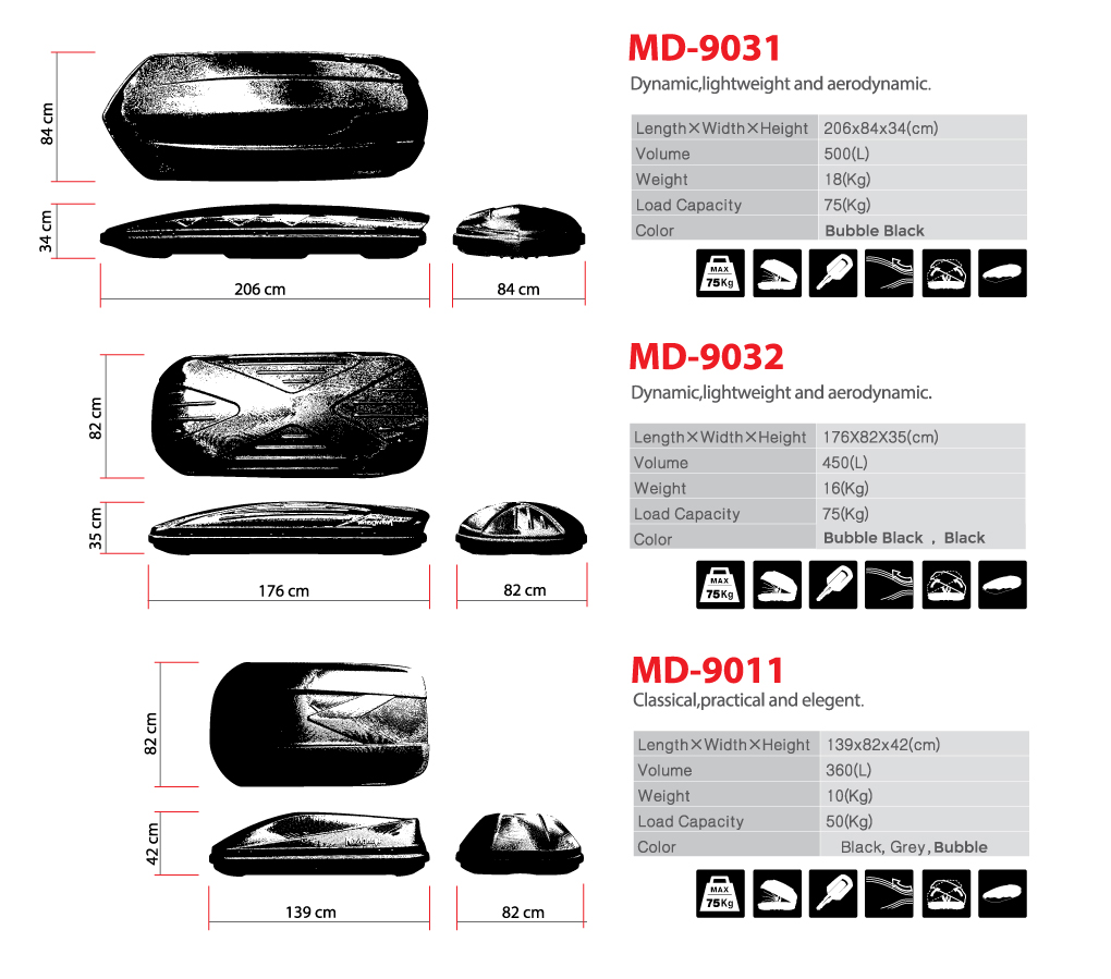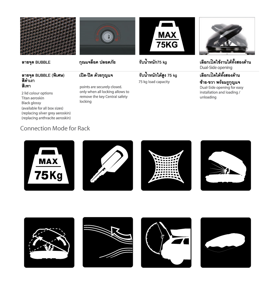 Roof Box กล่องใส่สัมภาระบนหลังคาดีไซน์ลู่ลม กันแดด กันฝน ทนทาน วัสดุ ABS ทุกขนาดสามารถเปิดได้สองทาง จะซ้ายหรือขวาก็ได้ สามารถรับน้ำหนักสัมภาระได้ถึง 75 kg. ติดตั้งง่าย จะใส่หรือจะถอดใช้เวลาไม่เกิน 5 นาที
